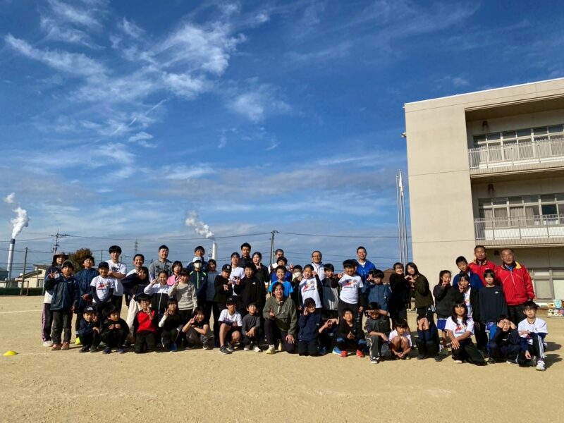 令和7年12月13日(土)、妻鳥小学校グラウンドにおいて、四国中央市の総合型地域スポーツクラブ「川之江TRACK&FIELDクラブ」の25周年記念イベントとして、陸上練習会が開催されました。